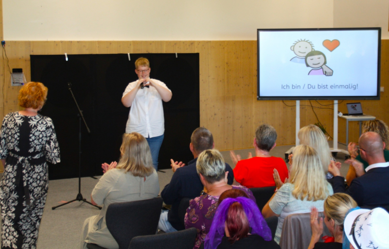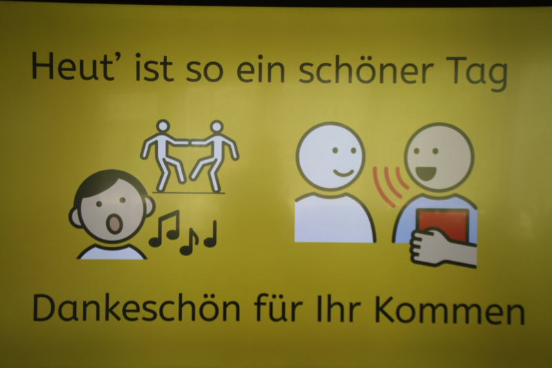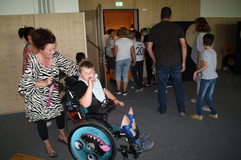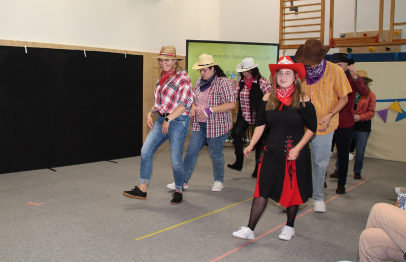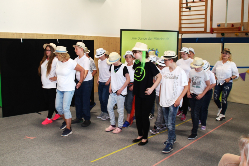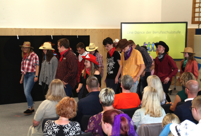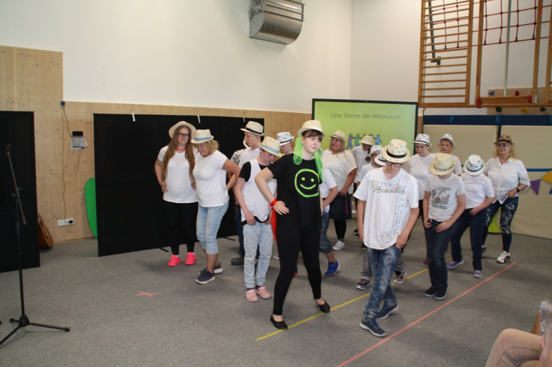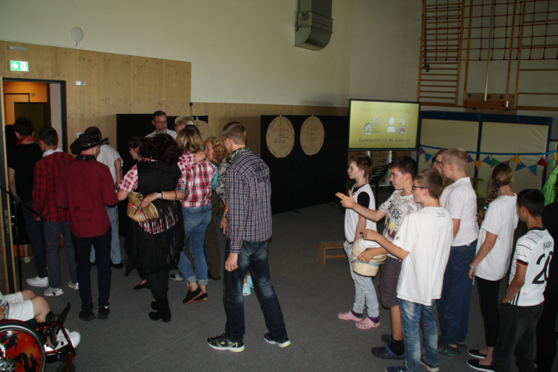 Nach einer kurzen Begrüßungs- und Eröffnungsrede durch unsere Schulleiterin Frau Schröder, zeigten unsere Schüler ein kleines Programm. Dabei ging es vorrangig tänzerisch zur Sache. Die Schüler der G2 sangen, begleitet von Gesten, das Lied von der kleinen Raupe Nimmersatt. Schüler der Mittel- und Berufschulstufe zeigten uns drei schwungvolle Line-Dance-Tänze, die unserern Bewegungsraum in Stimmung versetzte. Mit einem Lied und mit extra dafür einstudierten Gebärden zeigte uns Dustin, dass jeder Mensch einmalig und liebenswert ist, egal wie er aussieht oder fühlt.