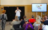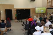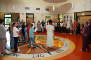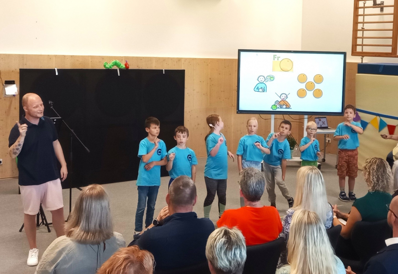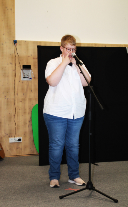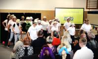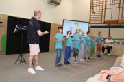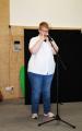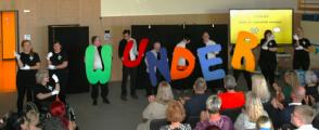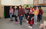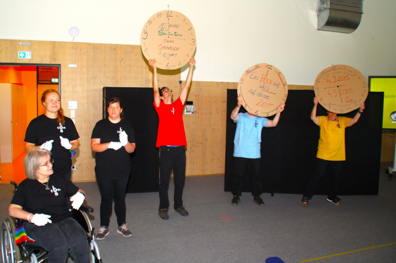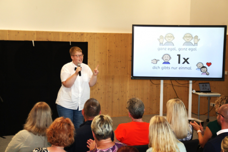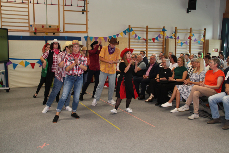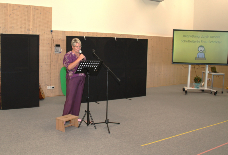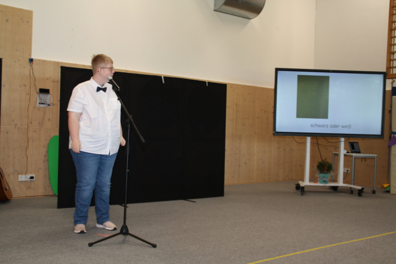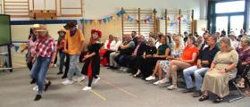 Nach einer kurzen Begrüßungs- und Eröffnungsrede durch unsere Schulleiterin Frau Schröder, zeigten unsere Schüler ein kleines Programm. Dabei ging es vorrangig tänzerisch zur Sache. Die Schüler der G2 sangen, begleitet von Gesten, das Lied von der kleinen Raupe Nimmersatt. Schüler der Mittel- und Berufschulstufe zeigten uns drei schwungvolle Line-Dance-Tänze, die unserern Bewegungsraum in Stimmung versetzte. Mit einem Lied und mit extra dafür einstudierten Gebärden zeigte uns Dustin, dass jeder Mensch einmalig und liebenswert ist, egal wie er aussieht oder fühlt.