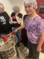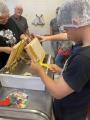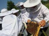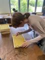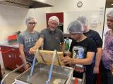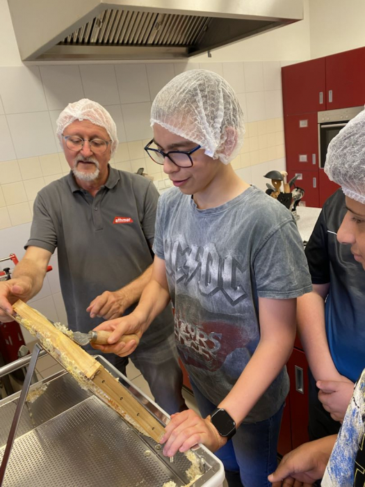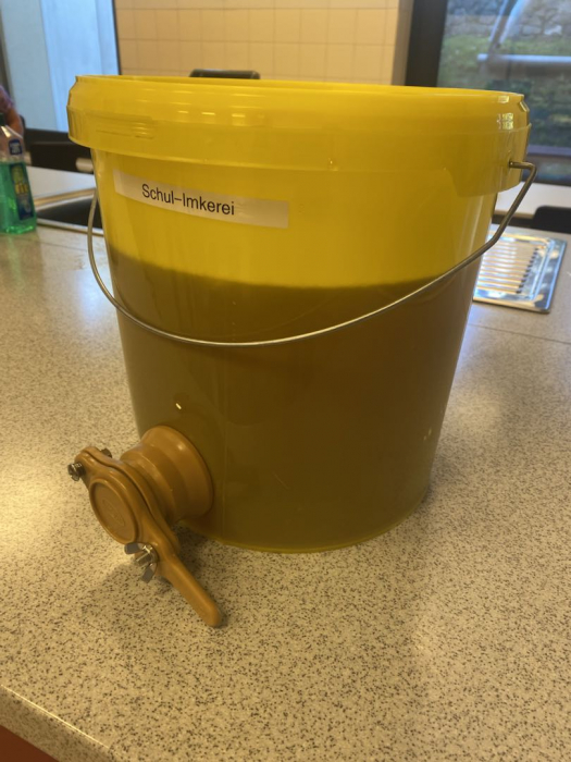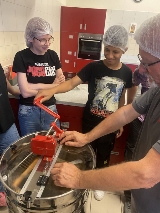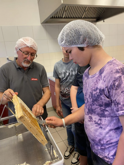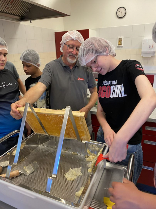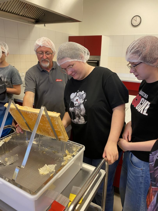 Ein ganz besonderer Höhepunkt war dann das Honigschleudern gleich zu Beginn des neuen Schuljahres. Gemeinsam entfernten wir den Honigraum und staunten über die vielen vollen Waben. In der Küche, ausgerüstet mit Haarnetzen, machten wir uns ans Werk: Zuerst wurden die Waben mit der Entdeckelungsgabel geöffnet – eine Arbeit, die viel Geschick verlangte. Anschließend kam die Honigschleuder zum Einsatz. Jeder durfte einmal drehen und miterleben, wie der goldene Honig langsam in den Eimer floss.