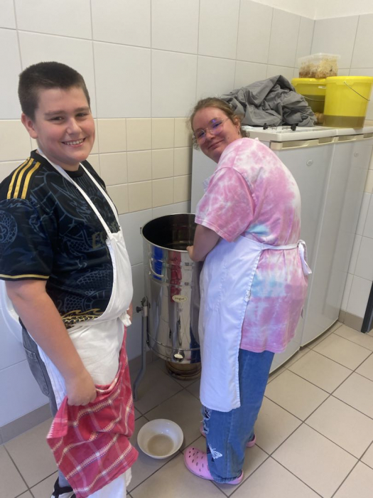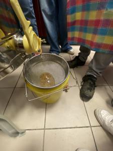 Am Ende konnten wir etwa 11 Kilogramm Honig ernten – ein tolles Ergebnis für das erste Jahr! Natürlich musste am nächsten Tag auch die Schleuder gründlich gereinigt werden. Nun wird der Honig noch cremig gerührt, bevor wir ihn abfüllen.