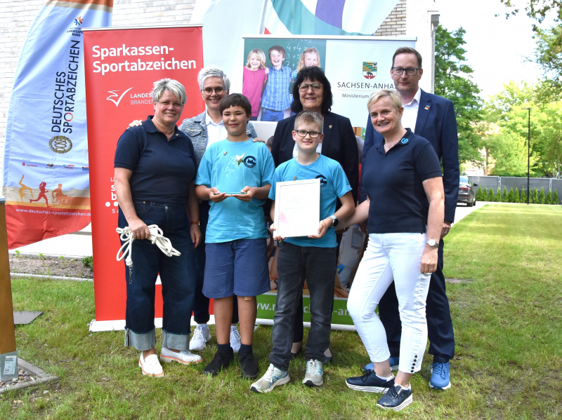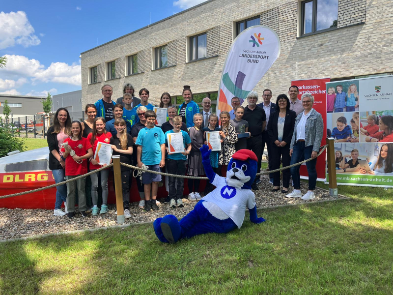 Am 06. Juni 2024 fand in Halle die feierliche Ehrungsveranstaltung des Sparkassen-Sportabzeichen-Wettbewerbs der Schulen im Land Sachsen-Anhalt statt. In einem festlichen Rahmen in den neuen Räumlichkeiten der DLRG wurden die besten Schulen des Landes für ihre herausragenden sportlichen Leistungen durch die Bildungsministerin, Eva Feußner, und die Präsidentin des LSB, Silke Renk-Lange, ausgezeichnet. Außerdem nahm Daniel Hennig vom Ostdeutschen Sparkassenverband diese Ehrung vor. Zeimlich aufgeregt fuhren Marcellino und Nick, Frau Schröder und Frau Siegmund nach Halle, um die Auszeichnung entgegenzunehmen.