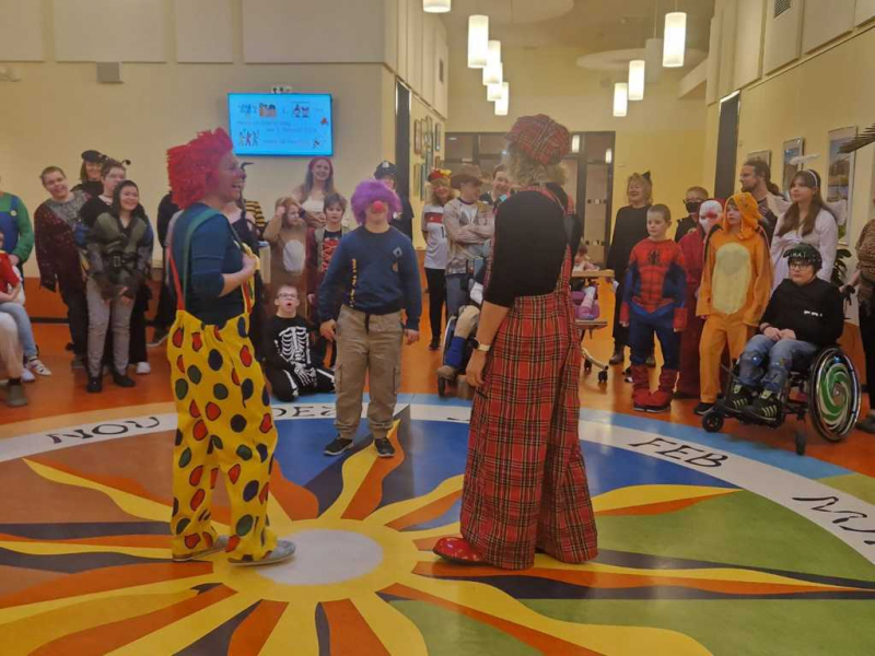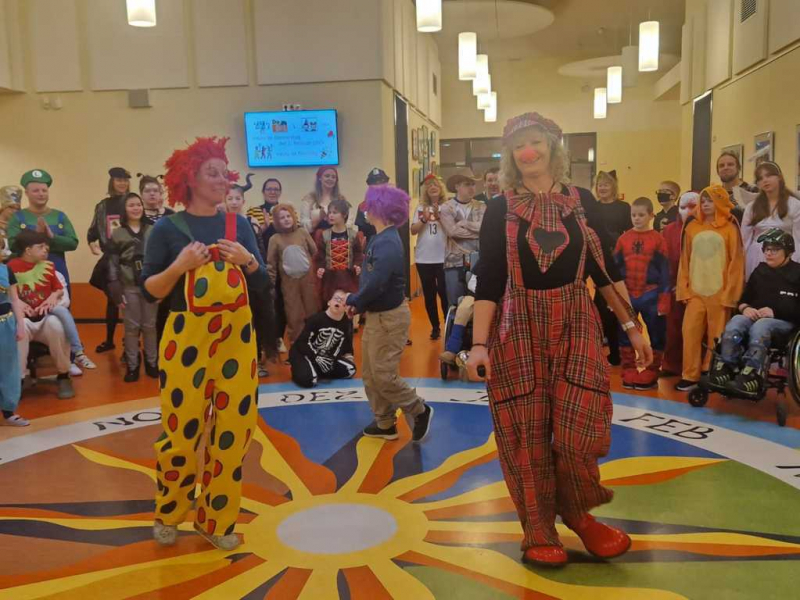 Im Anschluss begrüßte Clown Haraldino einen Teil des närrischen SINE-CURA- Volkes, wären der andere Tei in den Klassenräumen spielten und feierten. Zur Halbzeit gab es dann den Wechsel und auch der andere Teil der Narrenschaft durfte sich von Clown Haraldino und seiner Begleitung bis zum Mittagessen unterhalten lassen.