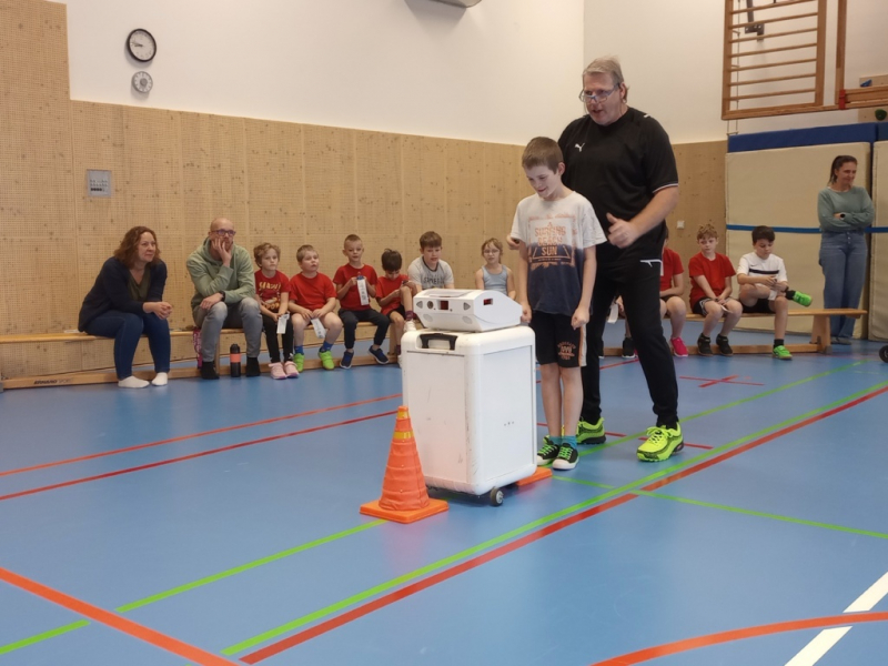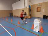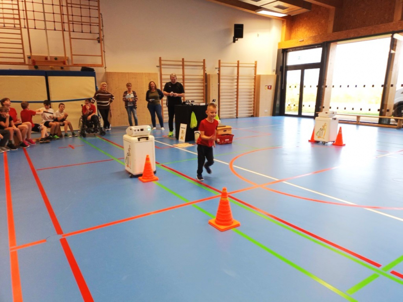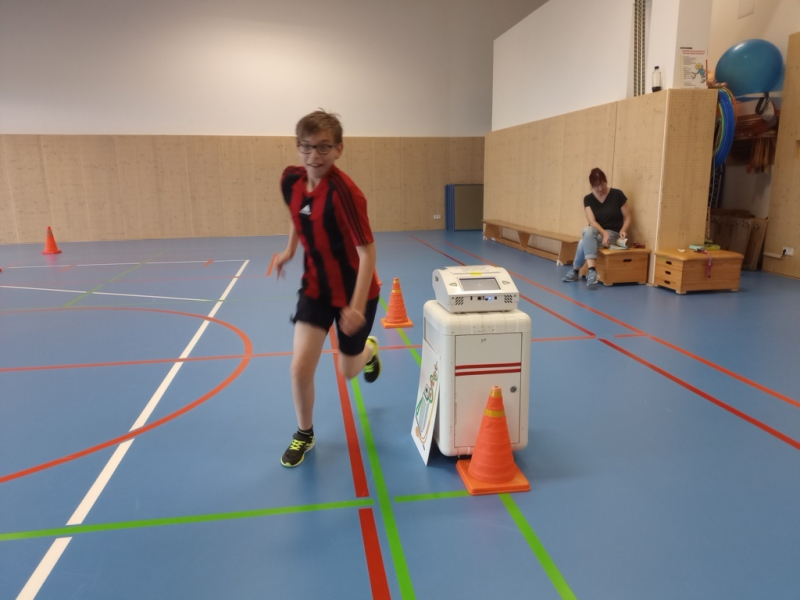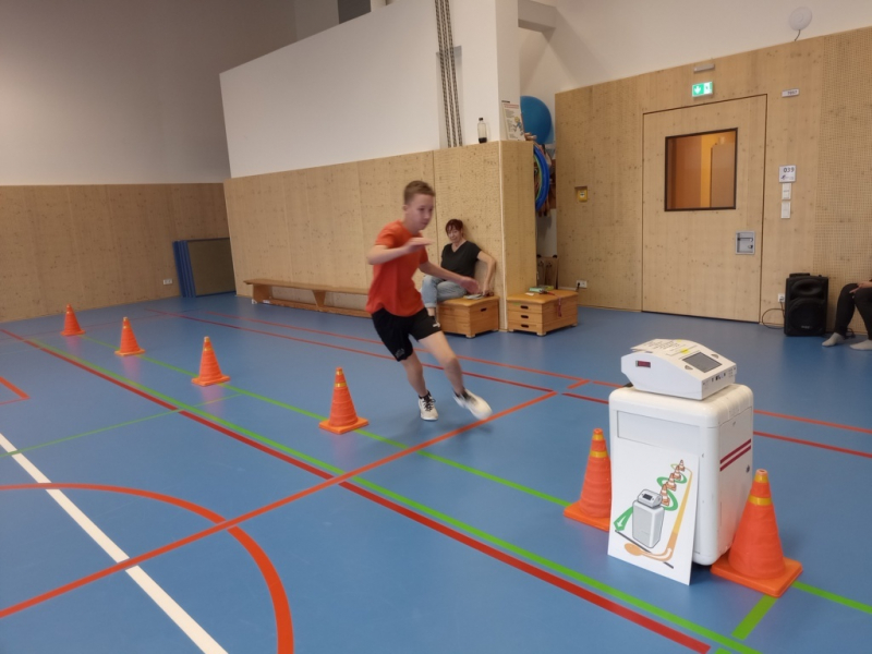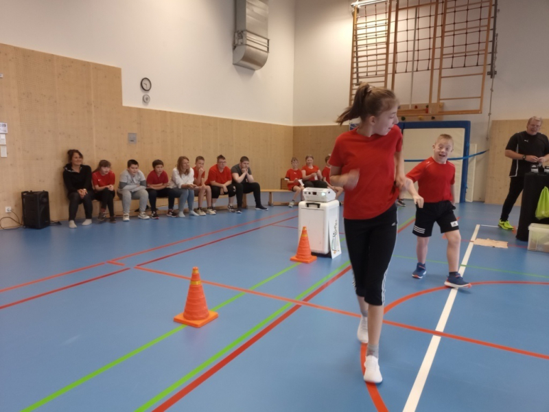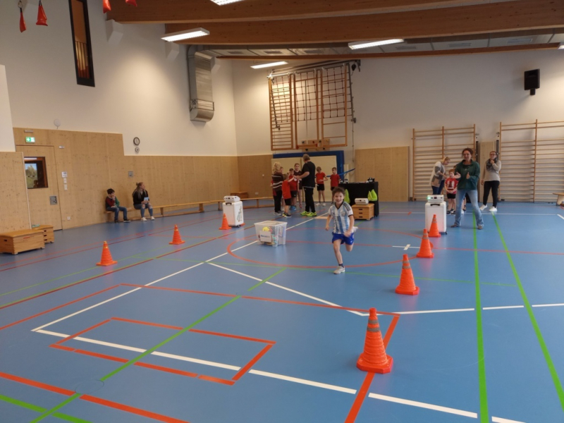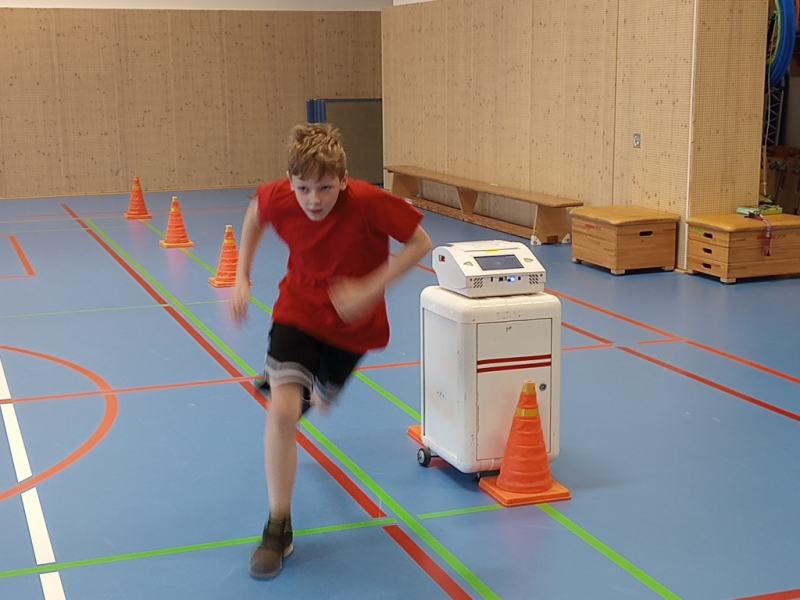 Am 9. November 2023 hatten wir duch die Unterstützung vom EDEKA-Markt Meyer wieder das Team vom Kinder-Sprint aus Leipzig in unserem Bewegungsraum zu Gast. Alle Grund- und Mittelstufenklassen waren eingeladen, ihre Bestzeiten auf einer kurzen Laufstrecke zu ermitteln. Gefragt war dabei aber nicht nur die das schnelle Laufen, sondern auch Gewandheit und Reaktion denn nach dem Drücken eines Startbuttons leuchtete erst nach ein paar Sekunden das Startlicht, welches angab, ob nach rechts oder links gestartet werden musste. Es folgte eine 10m lange Sprintstrecke bis zu einem Wendkegel, den man umlaufen musste um dann den Rückweg im Slalomlauf zu bewältigen.