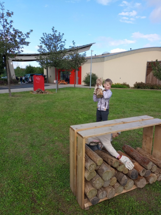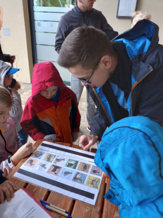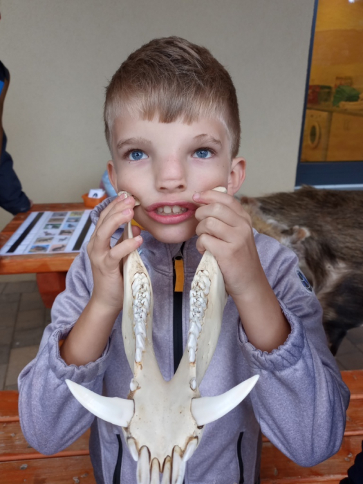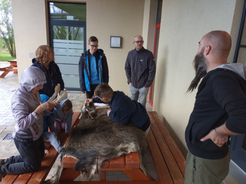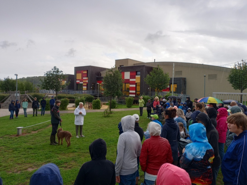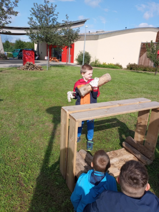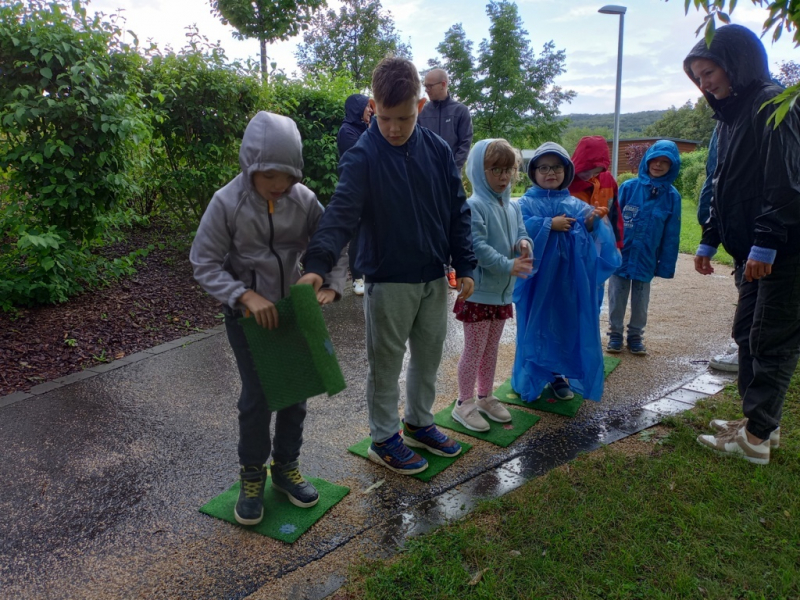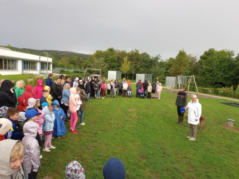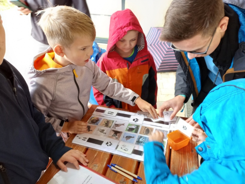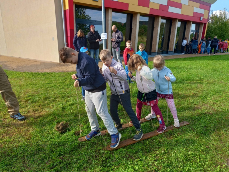 Mit viel Anschauungsmaterial lernten die Schüler etwas über die Bäume und Tiere des Waldes kennen. So gab es Felle und Geweihe zum Anfassen, Tierspuren mussten zugeordnet werden oder es konnten Werkzeuge der Waldarbeiter ausprobiert werden. Als Bewegungsaufgaben gab es "Holzscheitstapeln", "Inselhüpfen", "Zapfenzielwurf" oder ein Geschicklichkeitslauf, bei dem man vorsichtig wie ein Fuchs über ein Seillabyrinth steigen musste. Zur Erinnerung konnte sich jeder Schüler eine Holzplakette aus einer kleinen Baumscheibe basteln.