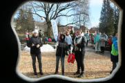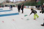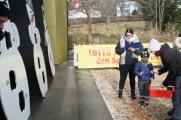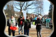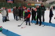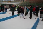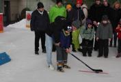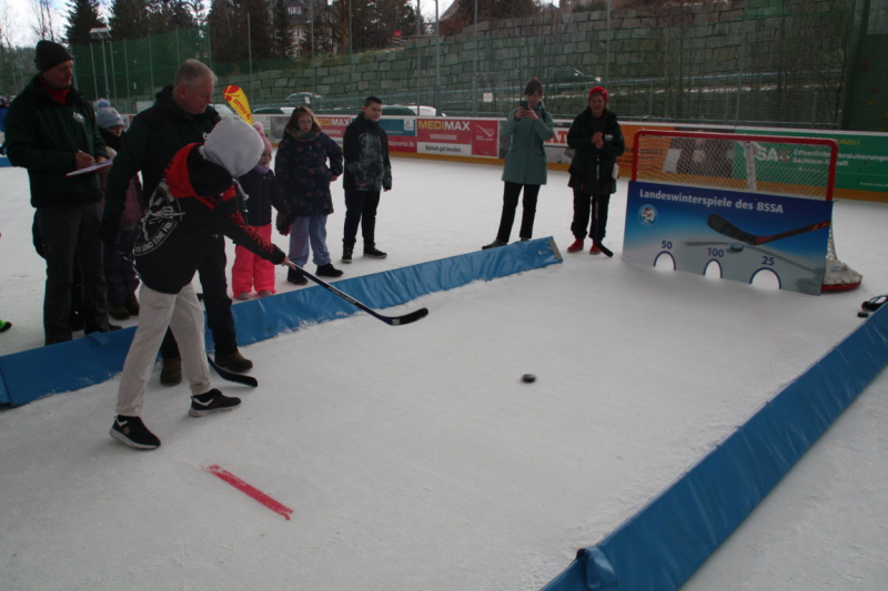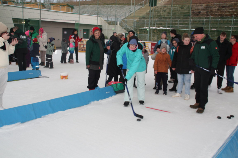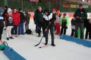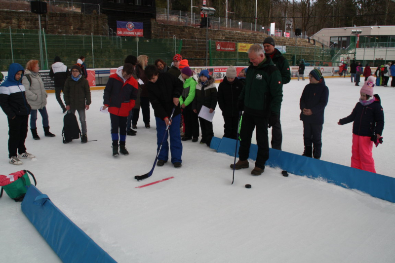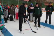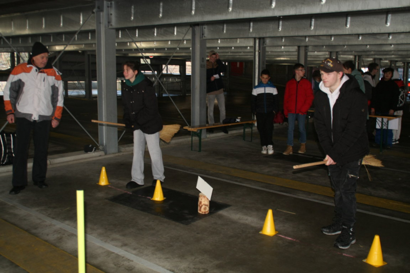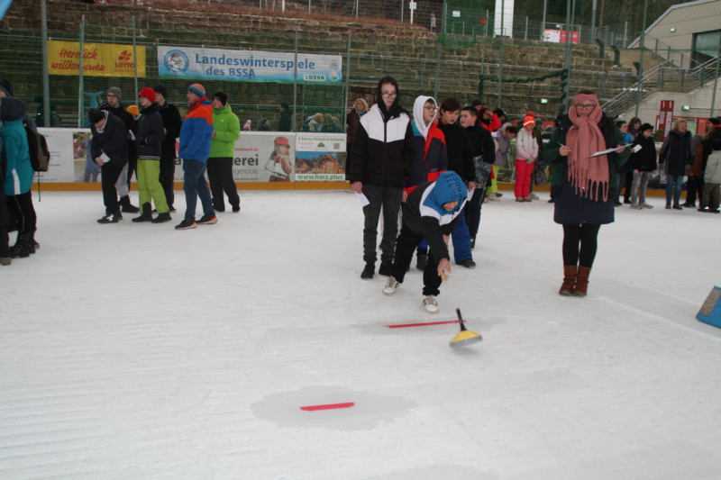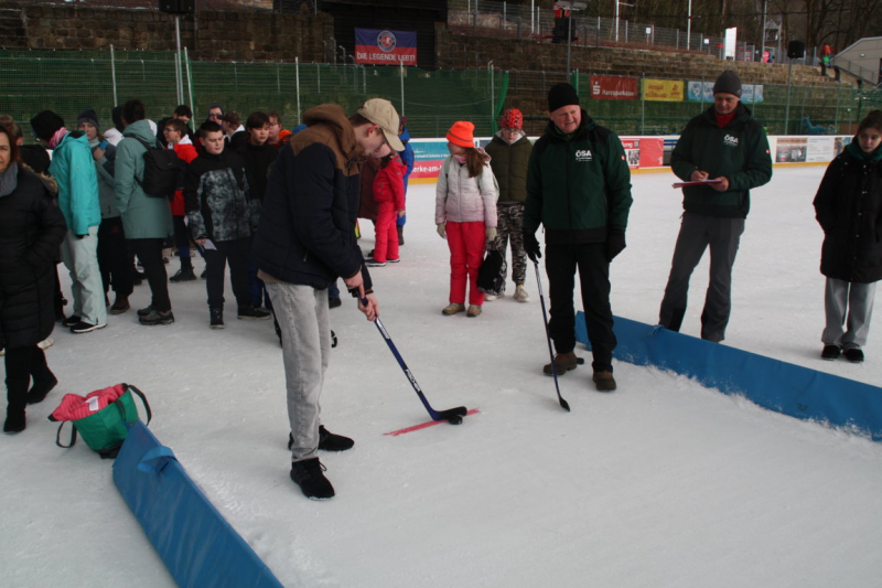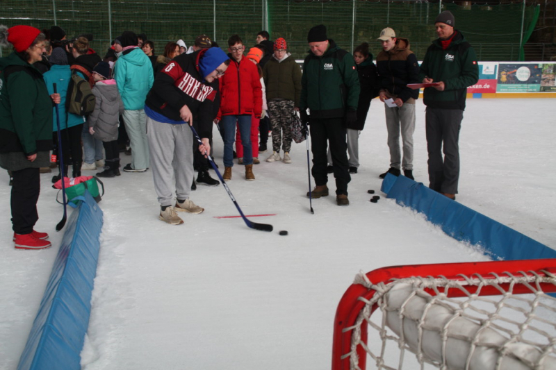 Im Anschluss ging es zu Fuß auf die 2km-Runde, auf der die verschiedenen Wettkämpfe und sportlichen Angebote zu absolvieren waren. Dabei gab es eine Neuerung. Statt des Rodelns/Rollbrettfahrens stand in diesem Jahr erstmals Eishockeypuck-Zielschießen auf dem Programm, was wir im Unterricht mit unseren Floorballschlägern fleißig geübt hatten. Auch das Zielwerfen und Eisstockschießen (in Form vom Bosseln) hatten wir im Unterricht vorher trainiert.