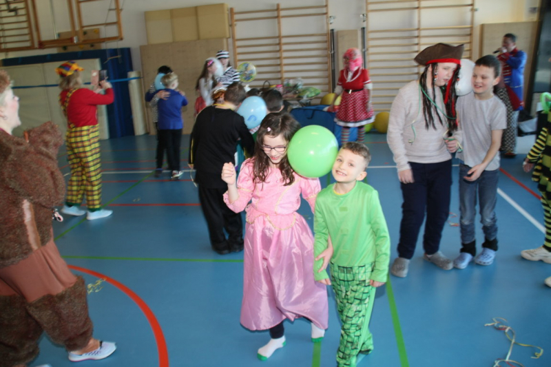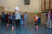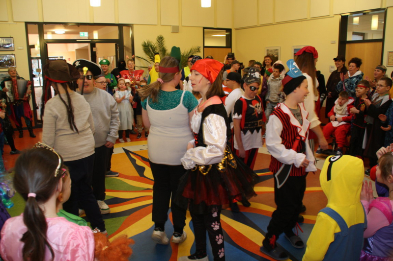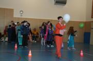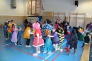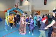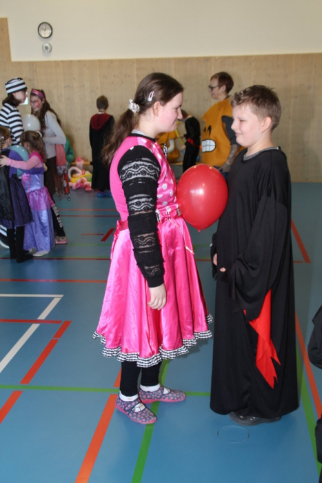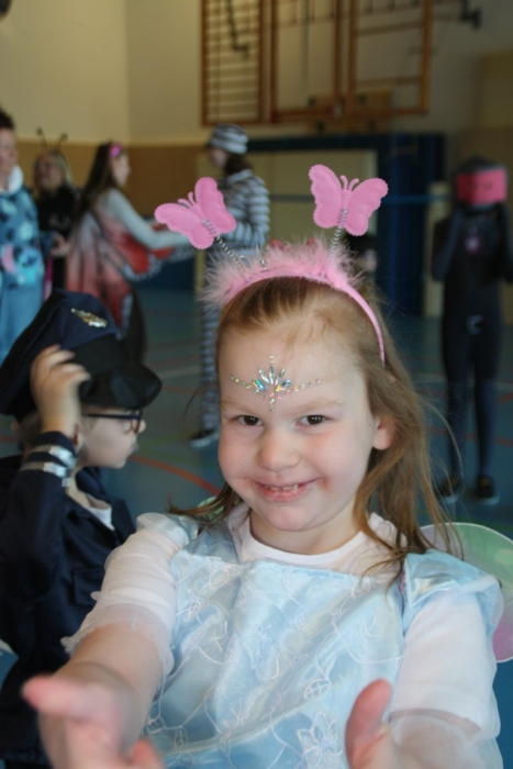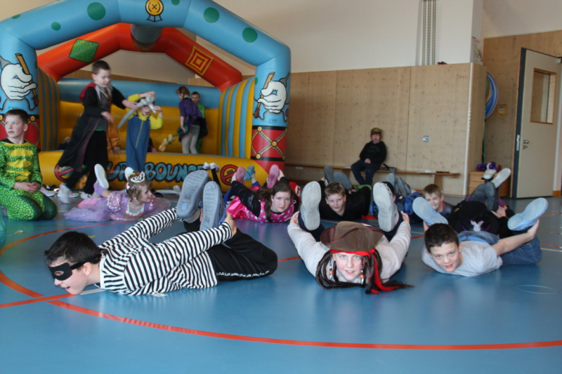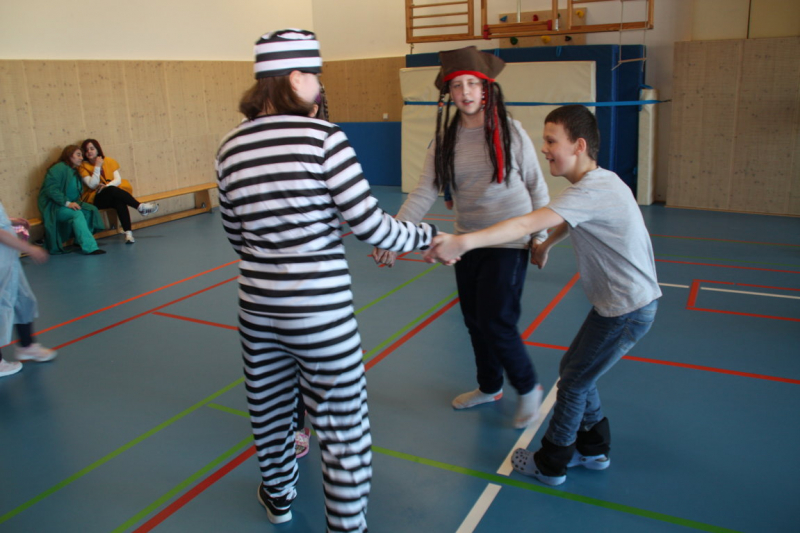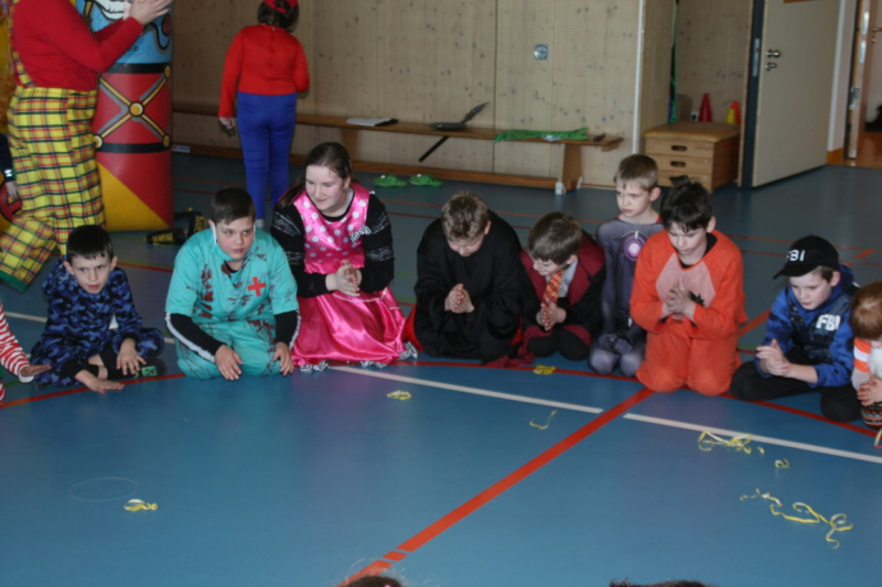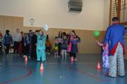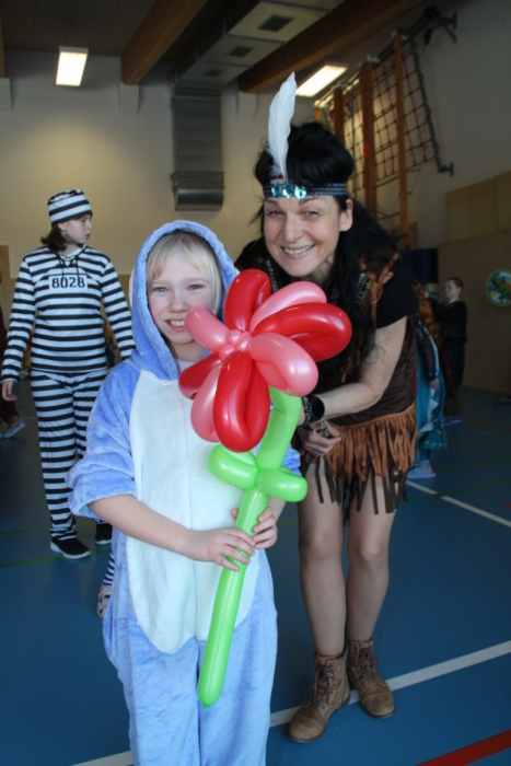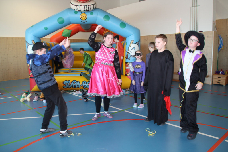 Fröhliches Treiben und gute Stimmung herrschte in unseren Räumen am 19. Februar. Die große Faschingsfeier stand auf dem Plan. Bunt kostümiert kamen alle am Morgen in die Schule und stimmten sich zum Frühstück in den Klassenräumen auf den Tag ein. Gemeinsam trafen wir uns dann auf der Sonne, um mit allen Schülern und Pädagogen die Feier zu eröffnen. Im Bewegungsraum wartete im Anschluss Clown Haraldinio, der erst mit den jüngeren und danach mit den größeren Schülern feierte, tanzte und verschiedene Spiele spielte. Außerdem gab es eine Hüpfburg, eine Krabbelstrecke und ein Glücksrad.