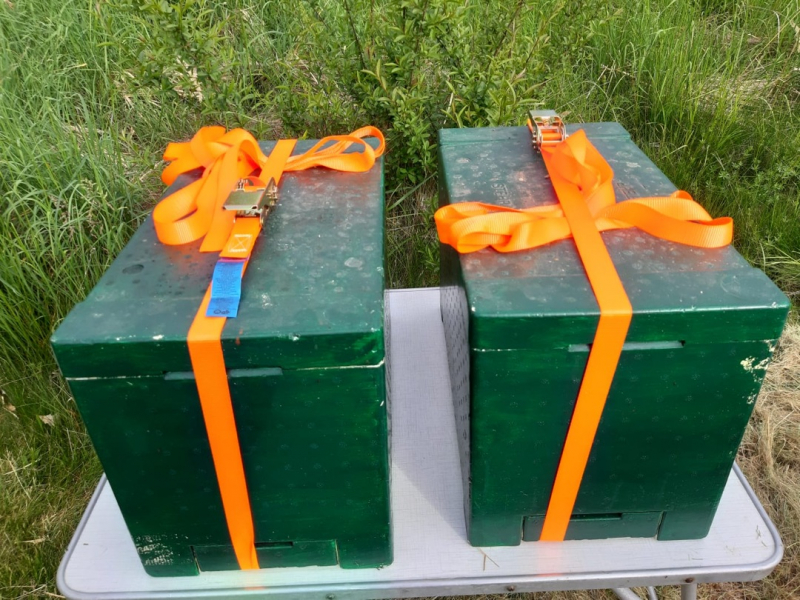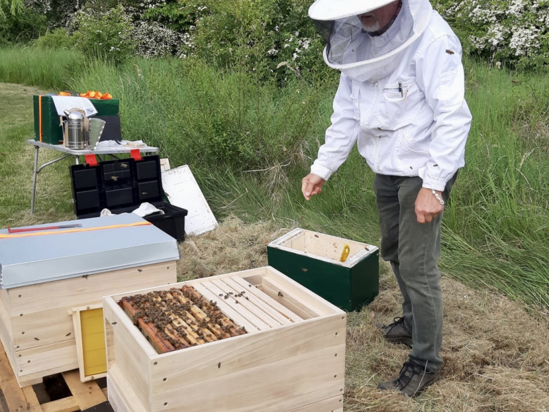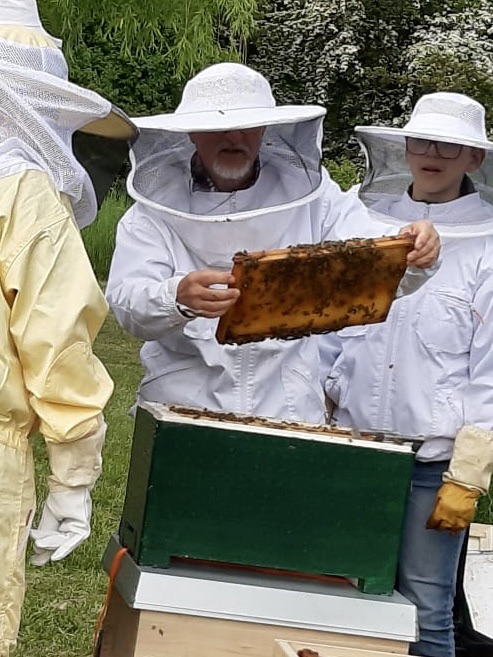 Herr Urban brachte zwei Bienenvölker mit, die jeweils von einer markierten Königin angeführt werden – eine rote und eine grüne. Diese farbliche Markierung gibt das Jahr an, in dem die Königin geschlüpft ist. So können wir leicht nachvollziehen, wie alt die Königinnen sind und ihre Entwicklung im Auge behalten.
